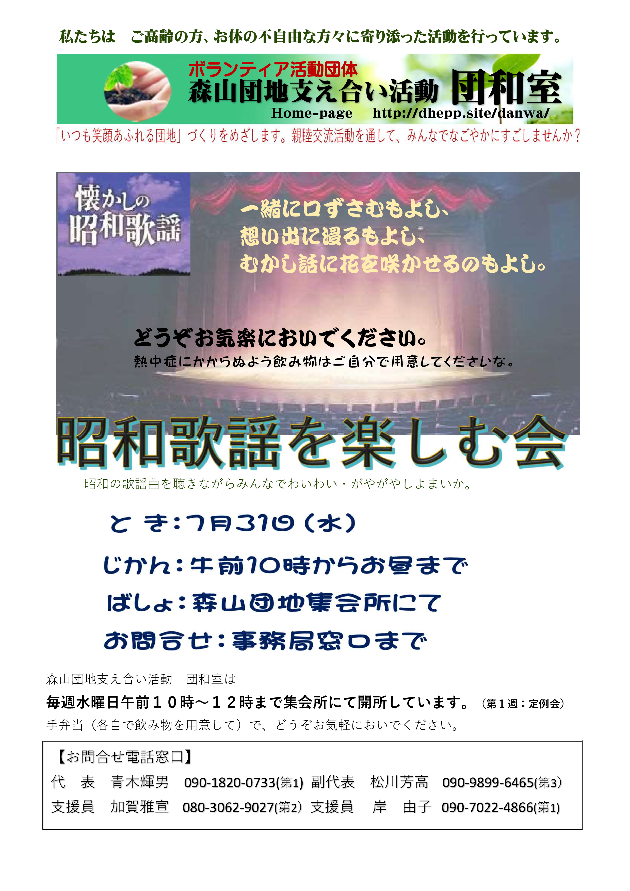 7月31日に行われた昭和歌謡を楽しむ会は残念ながら少数の参加者でした。が、曲のリクエストが出来たり、昔を懐かしむ機会が出来たりで有意義なひと時が持てました。次回企画では昭和歌謡のカラオケを予定しています。是非参加ください。追ってご案内いたします。