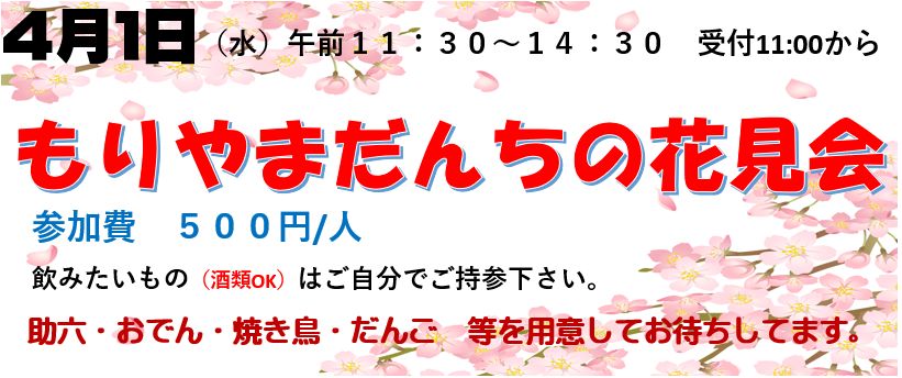 昨年は”持ち寄り花見会”として多くの皆様のご参加を頂きましたが、今年は「もりやまだんちの花見会」として開催する予定です。また皆様と一緒にワイワイガヤガヤと談笑の時間が持てたら良いですね。今回は会費制です。助六やおでんなどを取り揃えて皆様をお待ちいたします。
