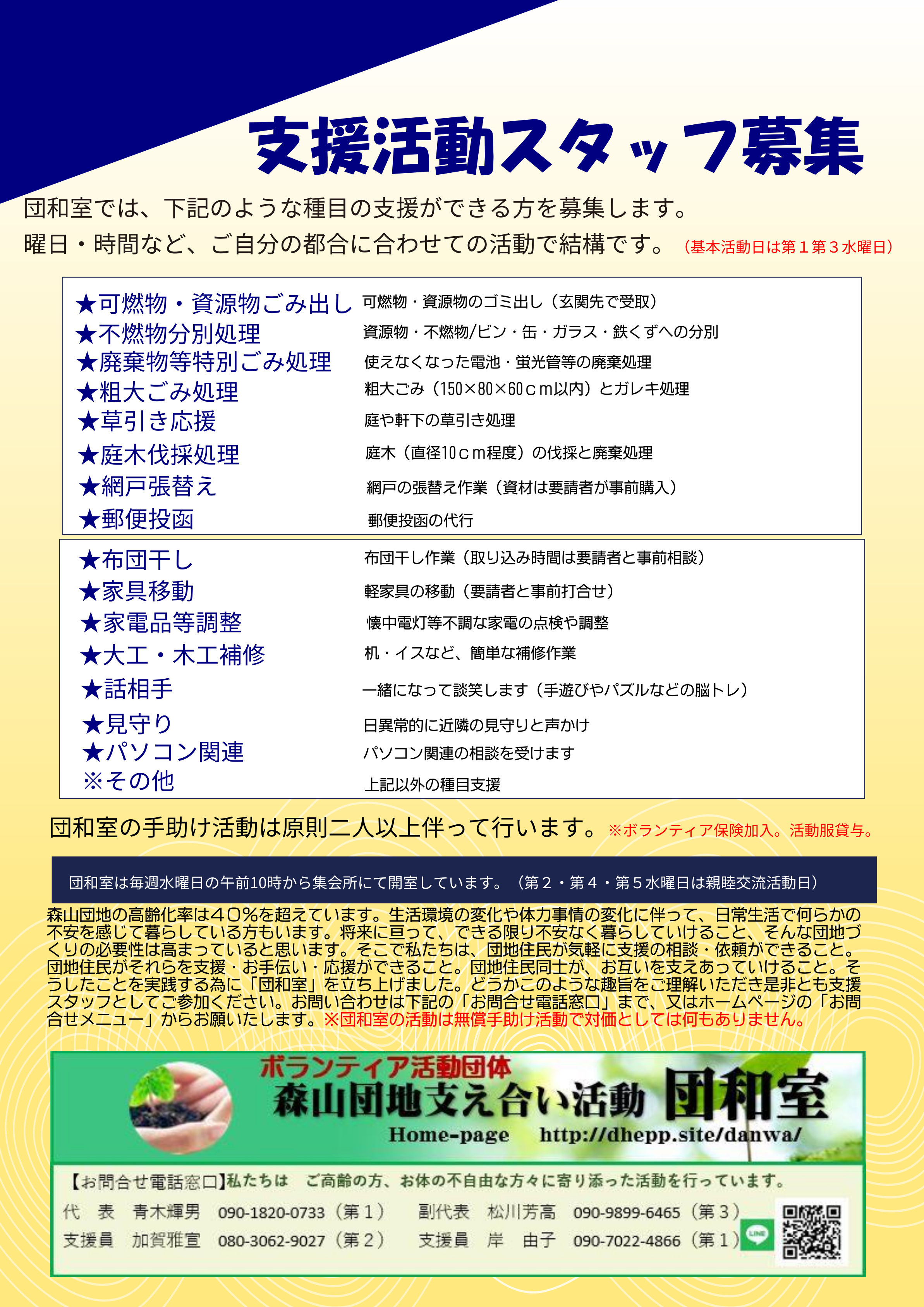 森山団地支え合い活動団和室では、以下の支援のできる方を募集しています。