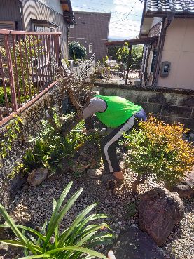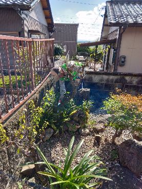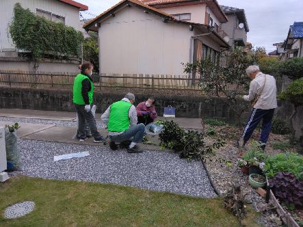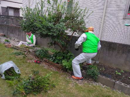 11月6日実施した直径約5cm高さ1・5m位の庭木を4本伐採し袋に入れ処分できるようにした。